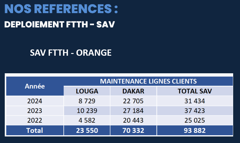 PREMIUM COMPANY SENEGAL offre est une prestation complète qui consiste à déployer un réseau de télécommunications en fibre optique depuis le nœud de raccordement de l’opérateur (point de concentration du réseau) jusqu’aux locaux de l’abonné final.PREMIUM COMPANY SENEGAL offre une solution clé en main qui couvre l’ensemble de la chaîne de valeur du déploiement fibre :